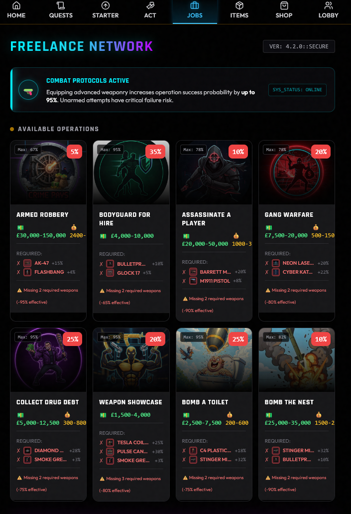 - Multiple Minigames โ Test your skills in bank heists, drone strikes, stealth missions, blackjack, roulette, and more.