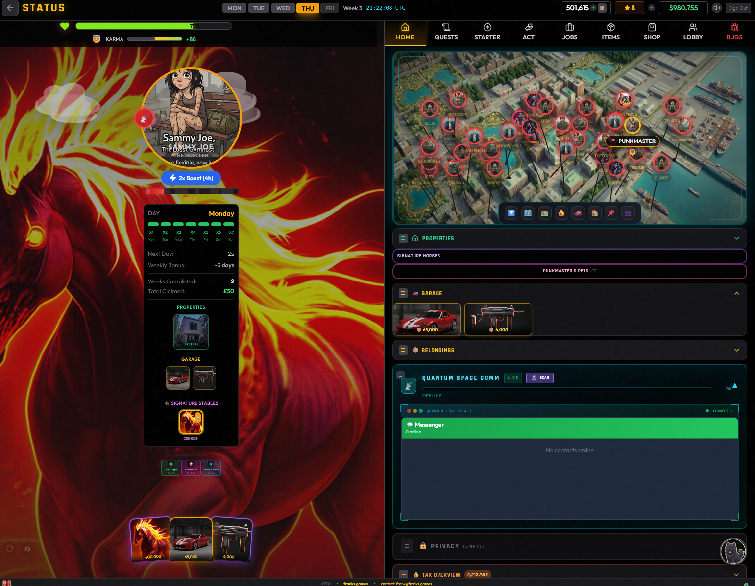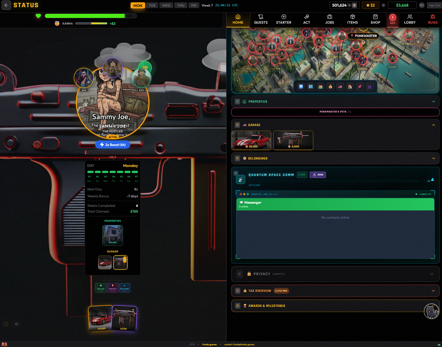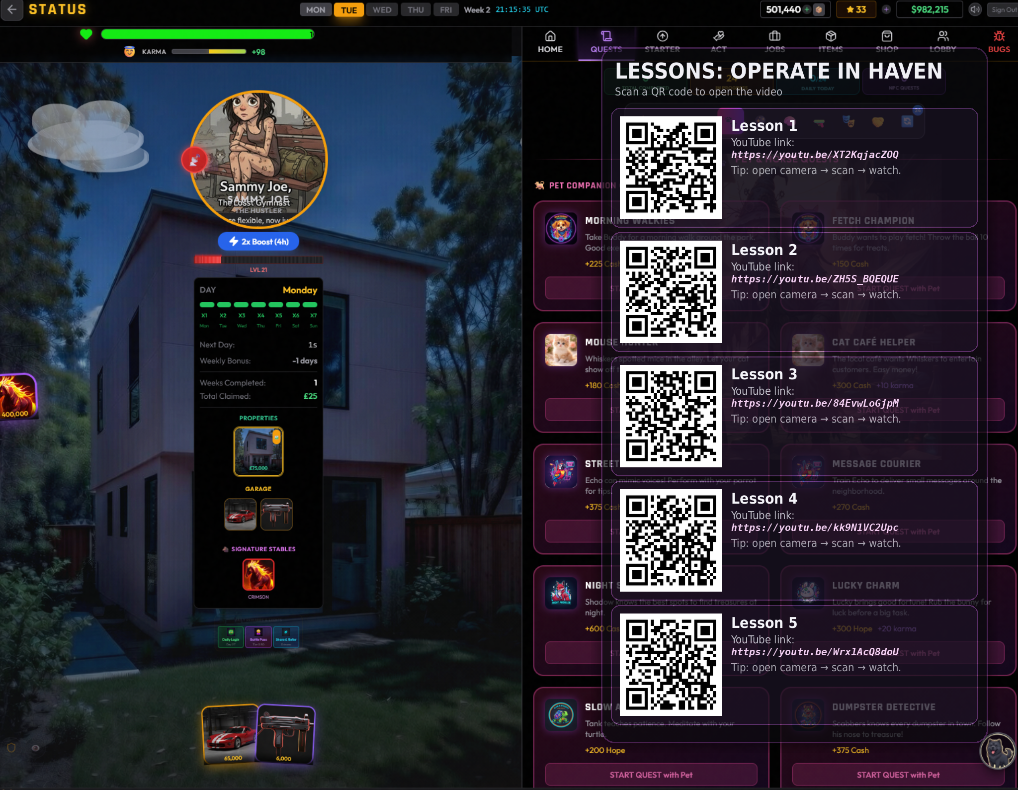 Start with nothing but a cardboard box and build your way up through the neon-lit streets. Haven Hearts is a unique idle/clicker game that blends dark cyberpunk aesthetics with a heartfelt story of survival and redemption.